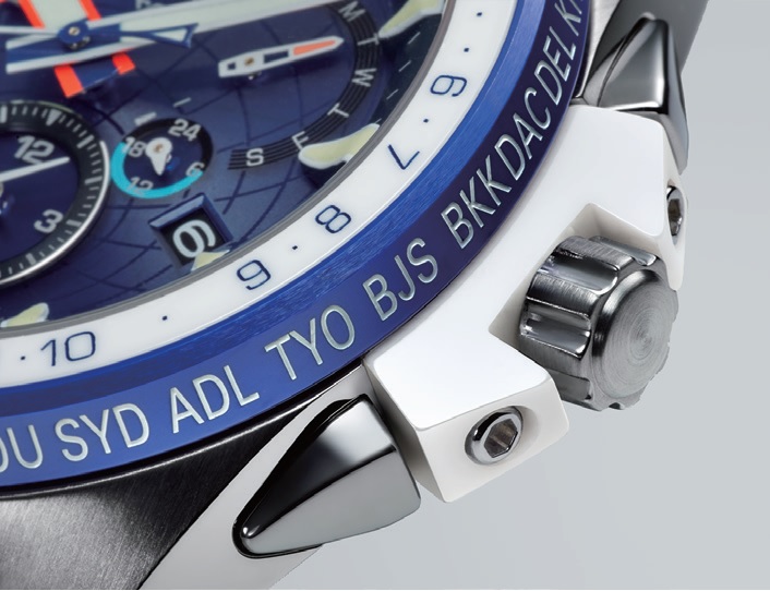 Двухцветный керамический безель с названиями городов. | Улучшенная видимость циферблата, стрелок и индексов. |